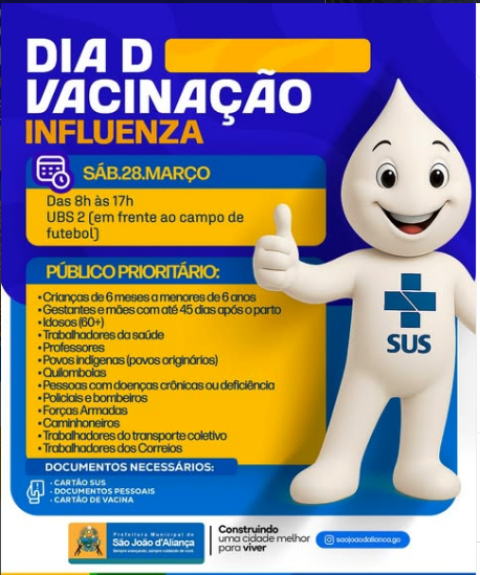 SÃO JOÃO d’ALIANÇA – Dia D de vacinação contra a gripe acontece neste sábado (28).