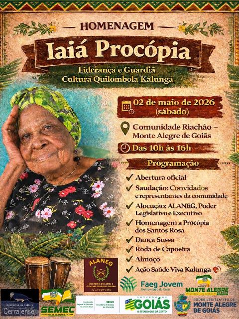 A Academia de Letras e Artes do Nordeste Goiano (ALANEG), em parceria com a Prefeitura Municipal de Monte Alegre de Goiás, Câmara de Vereadores de Monte Alegre de Goiás, Federação da Agricultura e Pecuária de Goiás (FAEG), Academia da Cultura Cerratense, Secretaria de Estado da Educação – Governo de Goiás e a Secretaria Municipal de Educação, realizarão essa homenagem em reconhecimento à sua trajetória de vida dedicada à defesa, valorização e preservação da cultura Kalunga.